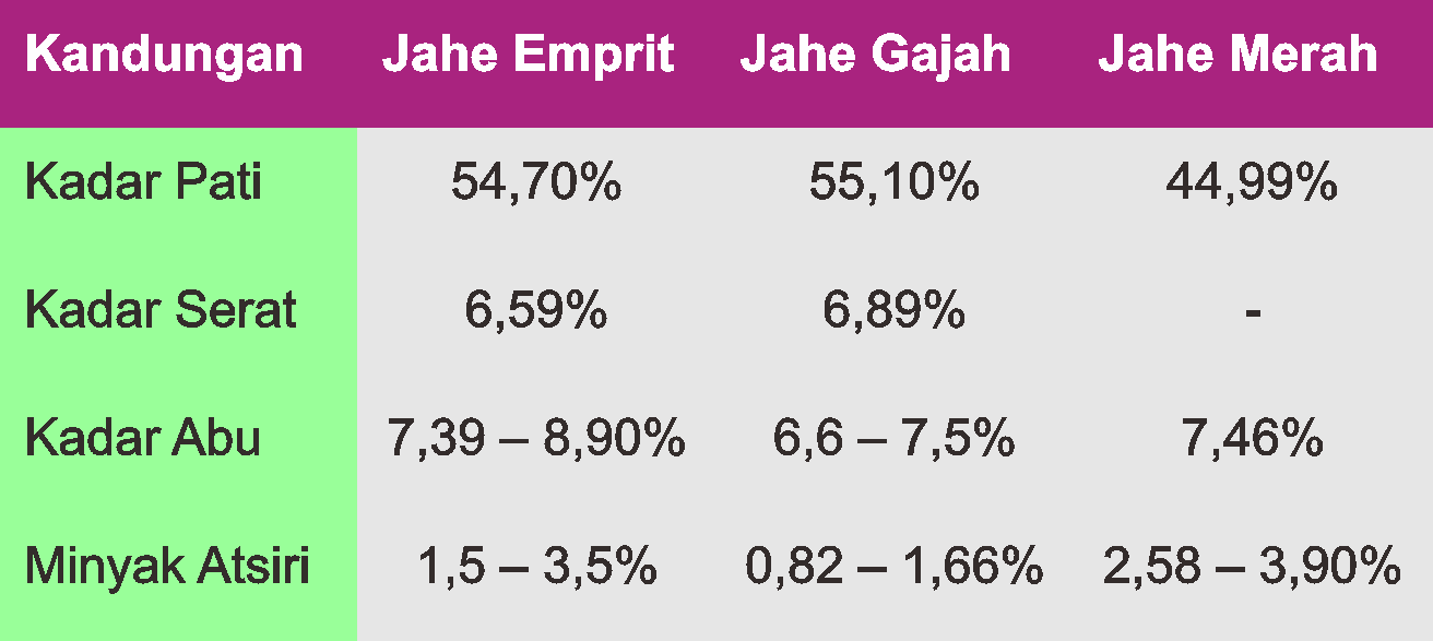 Secara kimia, jahe emprit, gajah dan jahe merah memiliki perbedaan yang tidak begitu nyata.
