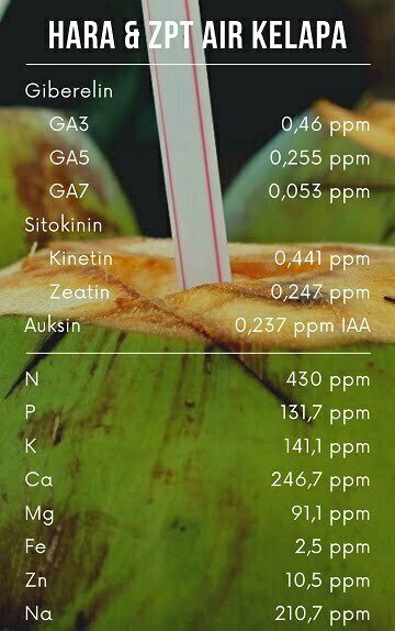 Hal ini karena ZPT dari air kelapa muda lumayan tinggi. Dari sumber ilmiah, berikut adalah data ZPT yang terkandung dalam air kelapa muda.
