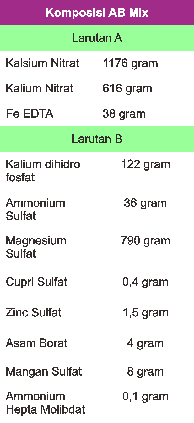 Nutrisi AB Mix terdiri atas komposisi mineral makro dan mikro. Informasi ini ada pada kemasannya.