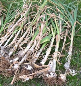 Setelah batang dan daun bawang putih kering, batang dipotong 2 cm di atas bagian umbi.