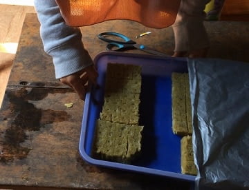 - Potong rockwool menjadi ukuran 2,5 cm x 2,5 cm dan dibasahi sampai basah. Tiriskan dan letakkan di nampan.
