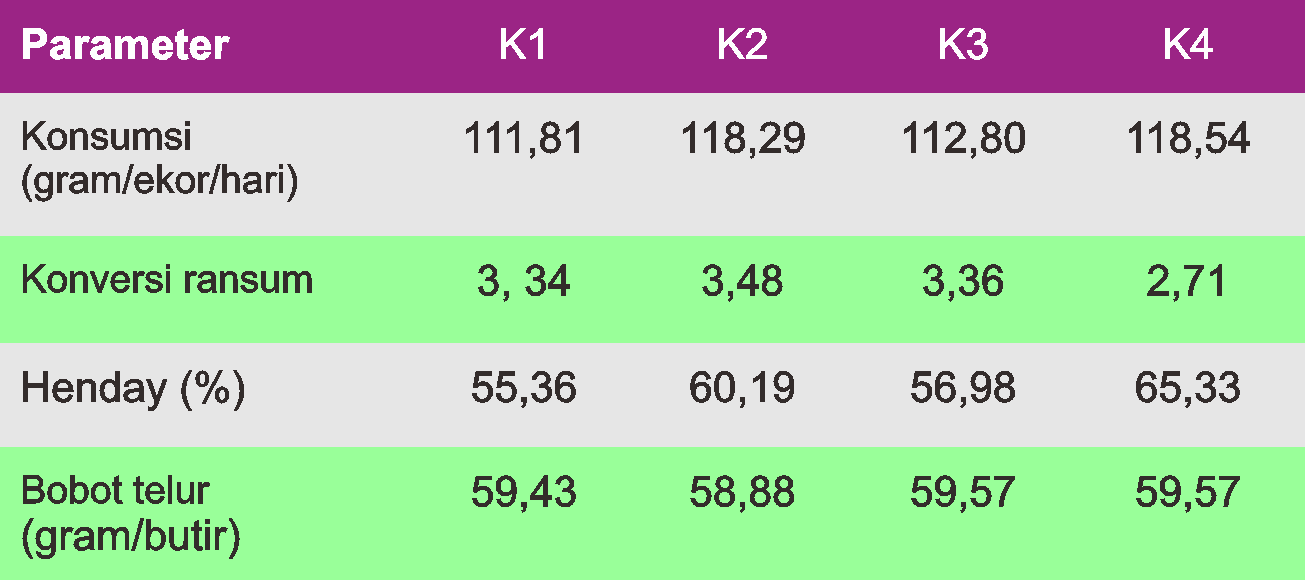 Akan tetapi, untuk produksi telur, bobot telur dan konversi ransum, hasilnya semakin menurun.