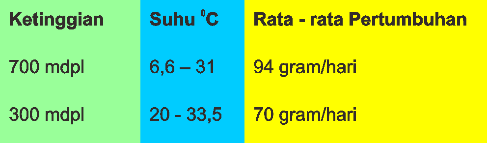 Di dataran tinggi, pertumbuhan kambing bisa lebih tinggi per harinya. Perbedaannya cukup lumayan, yaitu sebanyak 24 gram/hari.