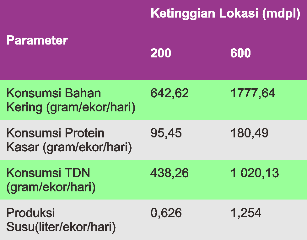 Dan menurut sumber penelitian lain[3], ternak kambing etawa yang dilakukan di ketinggian 200, 400 dan 600 mdpl konsumsi hariannya adalah seperti ini.