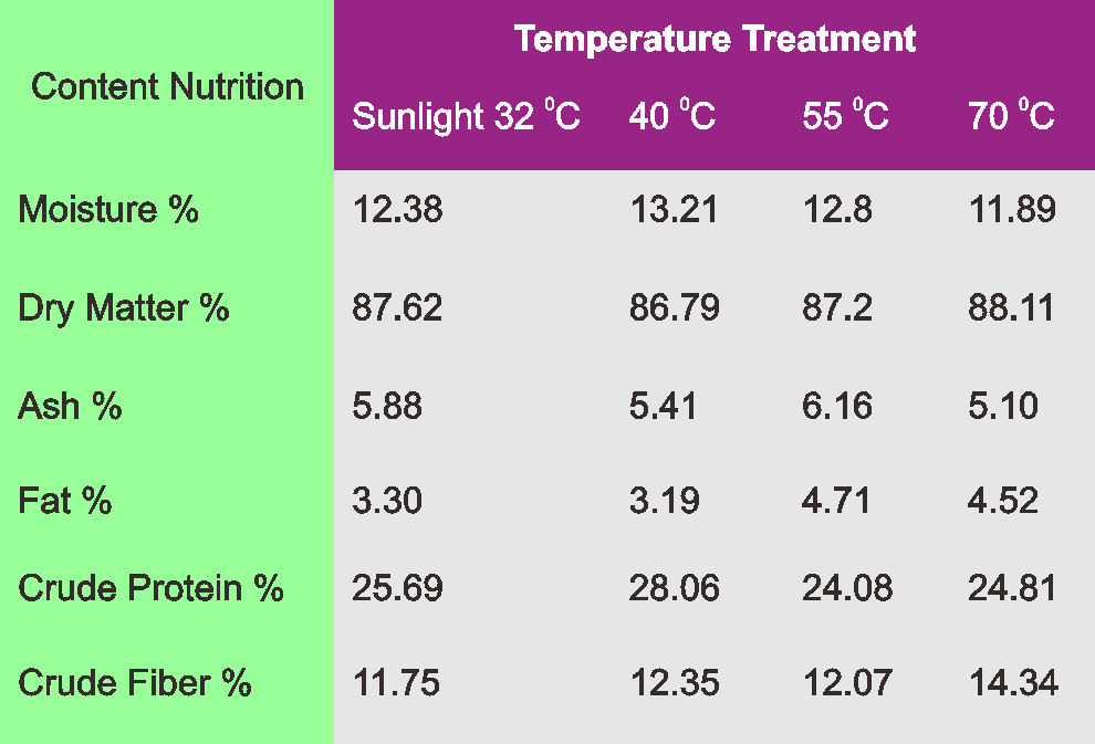 The picture above is a table picture between temperature treatment and nutrient content from dry matter, ash, fat, crude protein and crude fiber.