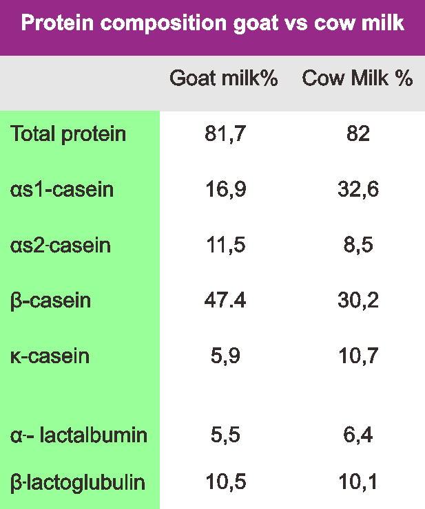 Goat milk has lower αs1-casein and αs2-casein higher than cow’s milk.