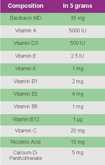 Bacitracin Md is the antibiotic. [2] Others are vitamins and nutrients that are required by quail.