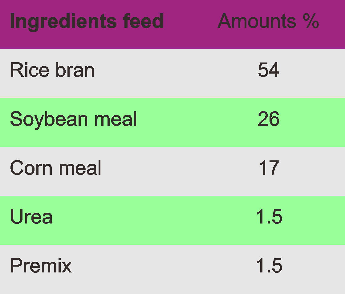 The concentrate is made by selfmixing. The ingredients consists of rice bran, soybean meal, corn flour, urea and premix.