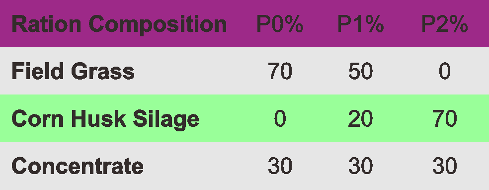 Corn husk is given in varying amounts ranging from without husk until the number of corn husk in the ration is as much as 70%.