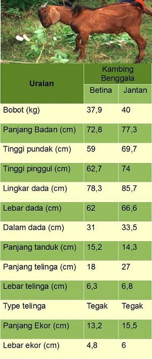 - Induk kambing Benggala rata-rata bobot badannya 37.9 kg (35-41 kg) dan Pejantan kambing Benggala rata-rata 40 kg (40-52.5kg).