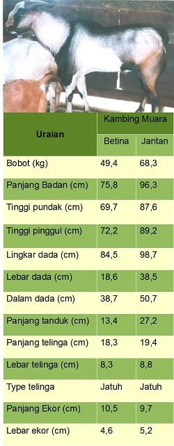 - Lebar dan dalam dada kambing Muara lebih panjang jika dibandingkan dengan kambing PE.