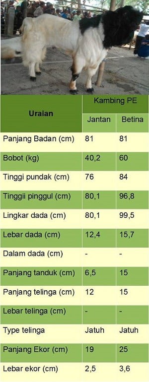 - Berat badan kambing PE jantan dewasa bisa mencapai 40 kg dan betina 60 kg, tinggi pundak 76-100 cm.