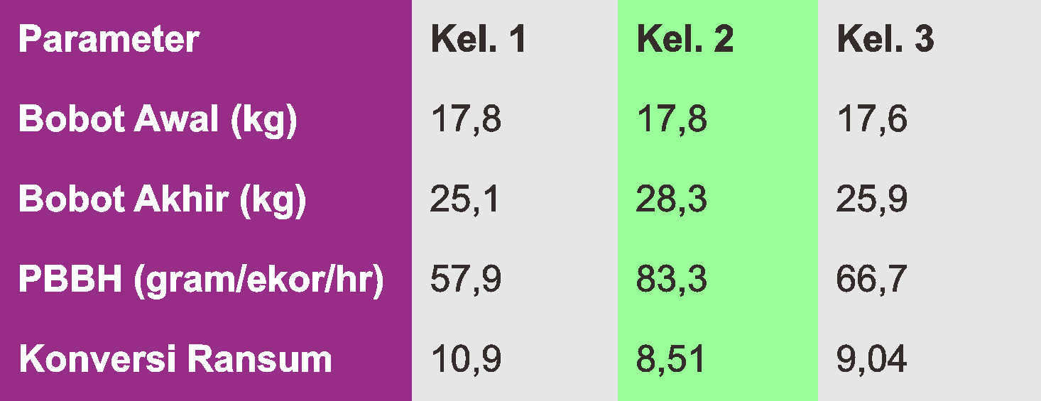 Sedangkan untuk kelompok ketiga, pakannya adalah rumput gajah sebanyak 35% dan konsentrat 65%.