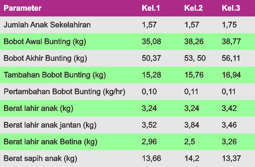 Jumlah anak sekelahiran ramsum hijauan rumput gajah nilainya sedikit lebih tinggi. Ini artinya pakan dengan hijauan berpotensi untuk lebih besar untuk menghasilkan anakan lebih dari satu.