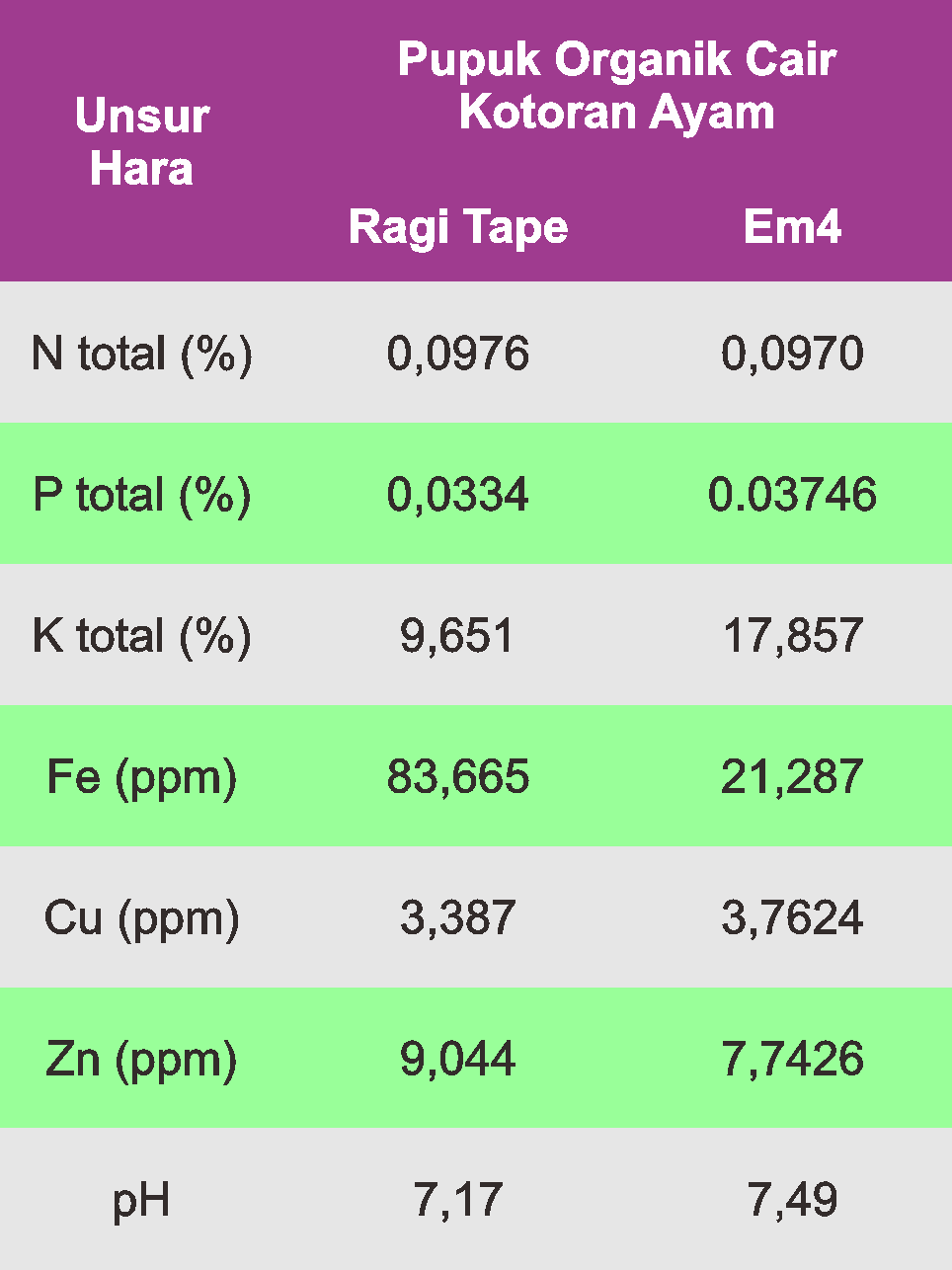 Menurut penelitian yang sama[5], kandungan unsur hara dari kedua cara di atas adalah sebagai berikut.