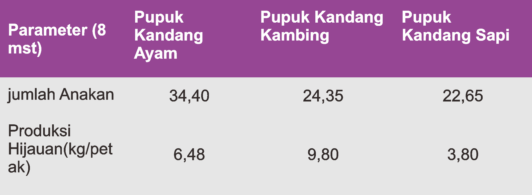 Menurut penelitiannya, untuk tanah jenis ini, jumlah terbaik pupuk kandang ayam yang digunakan adalah sebanyak 12 ton/hektarnya.