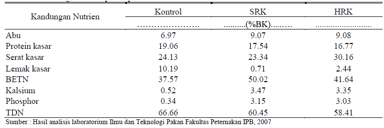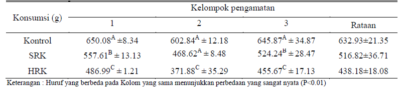 Kandungan protein ransum kontrol memiliki kandungan protein yang lebih tinggi dibandingkan dengan ransum SRK dan HRK, sehingga perbedaan kandungan nilai protein ini juga diduga dapat mempengaruhi tingkat konsumsi ransum kambing.
