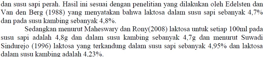 Hasil dari penelitian ini masih bisa didiskusikan lebih lanjut. Karena dari sumber yang peneliti sebutkan dalam penelitiannya, perbedaan jumlah laktosa antara susu kambing etawa dan susu sapi friesh holland memang lebih banyak susu kambing etawa, akan tetapi perbedaannya tidak signifikan.