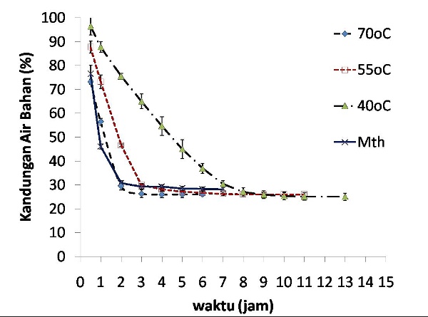 Hal tersebut dapat dilihat dari grafik bahwa 1-2 jam pertama pengeringan, jumlah kadar air langsung turun ke angka dibawah 30%.