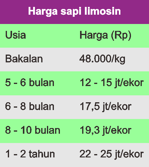 Kalau harganya belum berubah, informasinya harga bibit sapi limosin adalah seperti yang ada pada gambar.