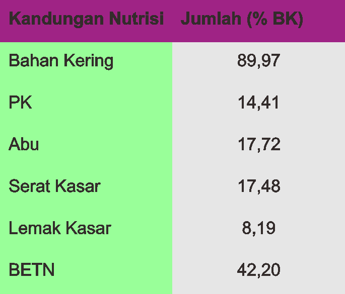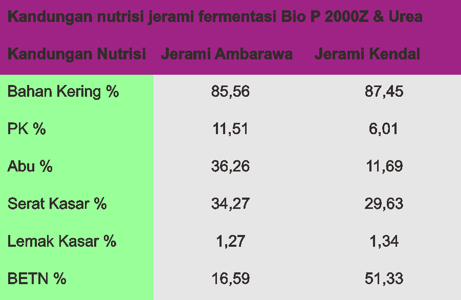 Setelah jerami padi difermentasi dengan cara di atas, menurut analisa laborat, kandungan nutrisinya adalah sebagai berikut.