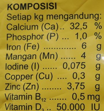 Dengan anjuran pemakaian 1 kg mineral setiap 100 kg ransum, maka kalsium, fosfor dan vitamin D pada ransum masing – masing akan ada tambahan sebesar 0,325%, 0,01% dan 500 IU.