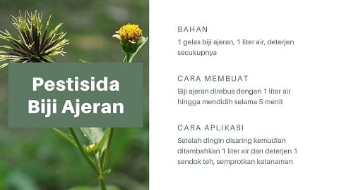 Cara aplikasi : Setelah dingin disaring kemudian ditambahkan 1 liter air dan deterjen 1 sendok teh, semprotkan ketanaman