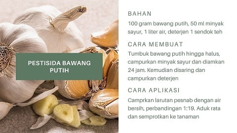 Cara membuat : Tumbuk bawang putih hingga halus, campurkan minyak sayur dan diamkan 24 jam. Kemudian disaring dan campurkan deterjen.