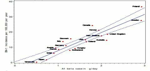 Semakin tinggi konsumsi beta kasein A1 per kapita, kasus terjadinya diabetes militus tipe 1 juga semakin tinggi.