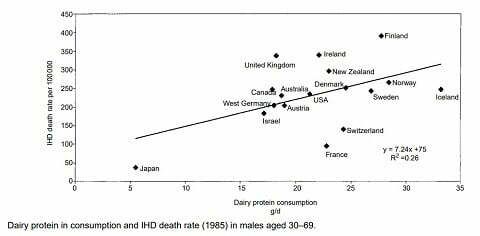 Pada bagian kanan adalah tingkat kematian per 100.000 kasus penyakit. Dan bagian bawah adalah jumlah konsumsi beta kasein A1 setiap harinya (gram/hari).